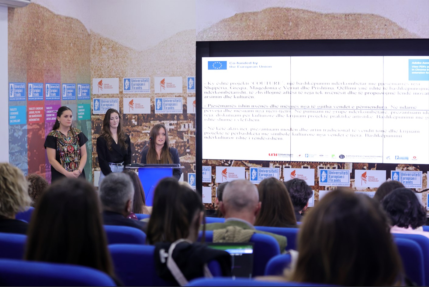 A highlight of the event was the student showcase: fashion students from partner institutions presented finished design projects on site, demonstrating how COUTURE methodology translates into practical work — from concept sketches and material experiments to completed garments that combine traditional motifs with contemporary design. A dedicated pop-up exhibition of Albanian traditional costumes further illustrated the project’s emphasis on heritage-informed innovation.